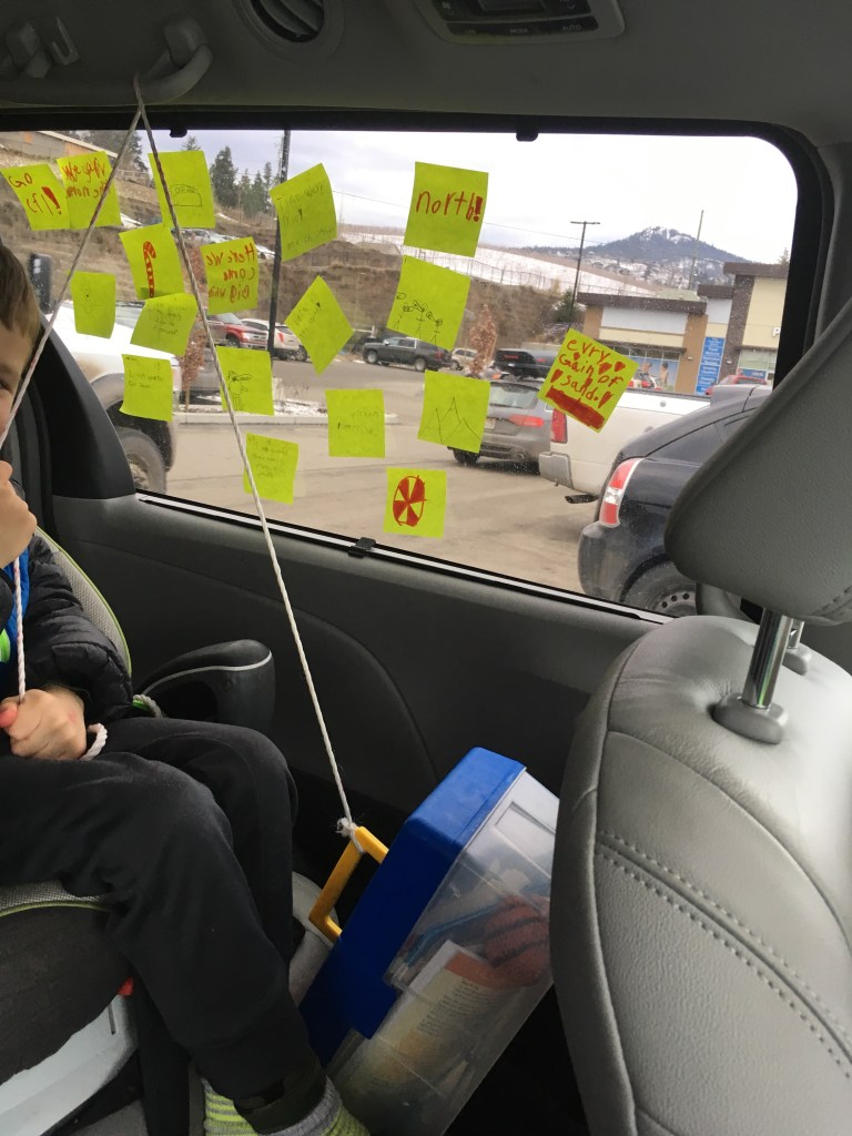 - Invented a new version of the “Florida or Bust” signs that I used to see in car window’s on I-75 South Bound during spring break. HB used most of a pad of sticky notes writing messages to passing cars. The notes included “Merry Christmas”, “Big White, here we come”, “We the North”, and “I love adventure.” The notes are still there.