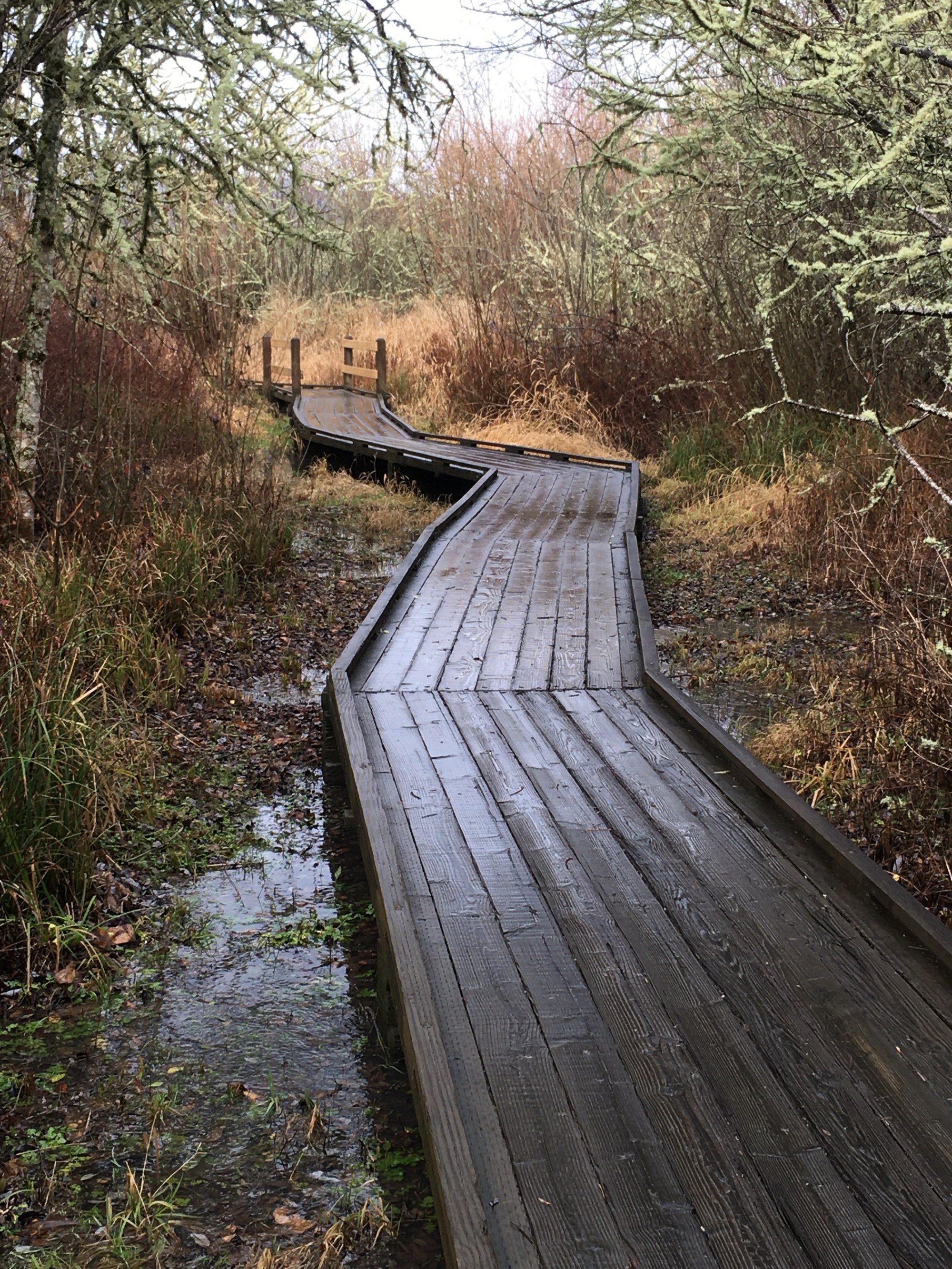It was a nice day in Oregon for a hike on a boardwalk. We found two geo-caches, got plenty of mud on our boots, and had snacks in our van.